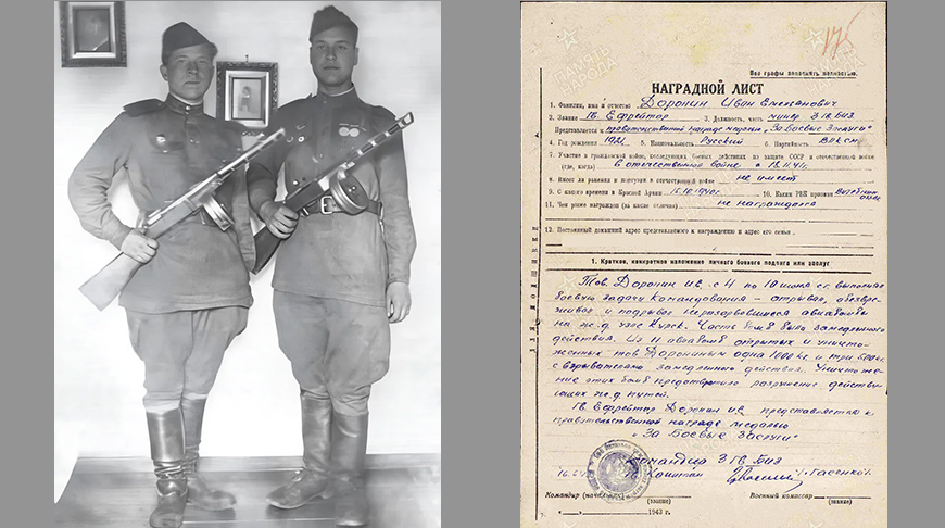 W 1943 roku Iwan Doronin został odznaczony medalem „Za zasługi bojowe” za wypełnienie szczególnie ważnej misji bojowej. Od 4 do 10 czerwca rozbrajał i detonował niewybuchy na węźle kolejowym w Kursku, ryzykując życie w każdej minucie. Niektóre z pocisków działały powoli. W karcie wyróżnienia odnotowano, że z 11 wykopanych i zniszczonych przez niego bomb jedna ważyła tonę, a trzy kolejne po 500 kg. Jednocześnie niszczenie pocisków odbywało się bez niszczenia podkładów kolejowych. Możemy tylko przypuszczać, ile wysiłku i umiejętności włożył nasz rodak w wykonanie zadania dowództwa.
